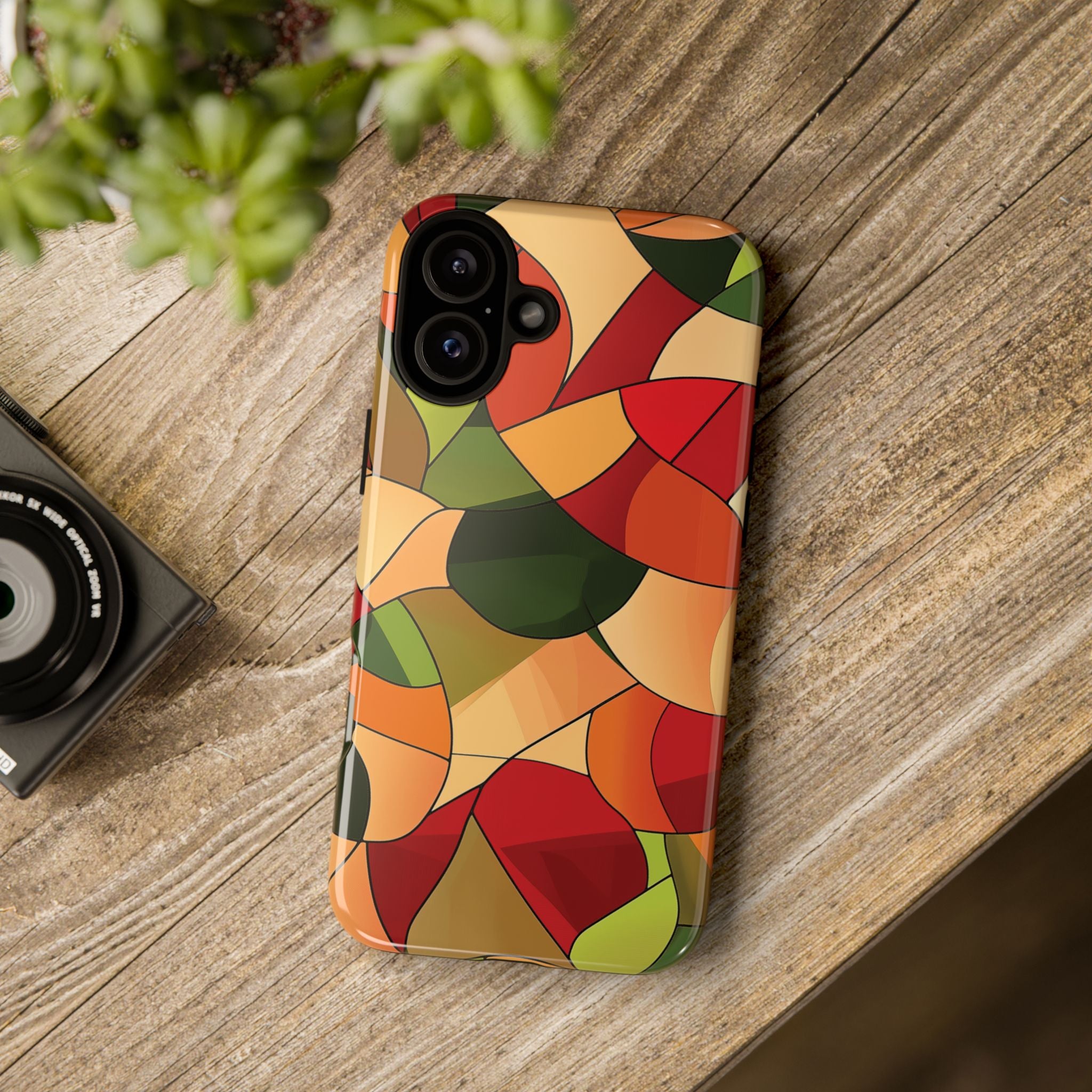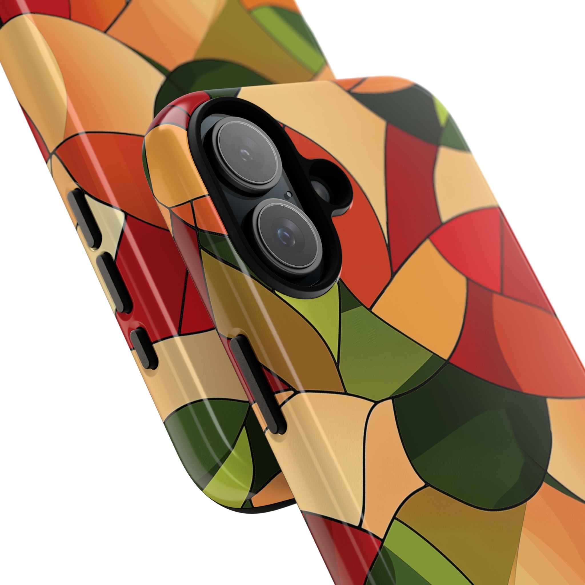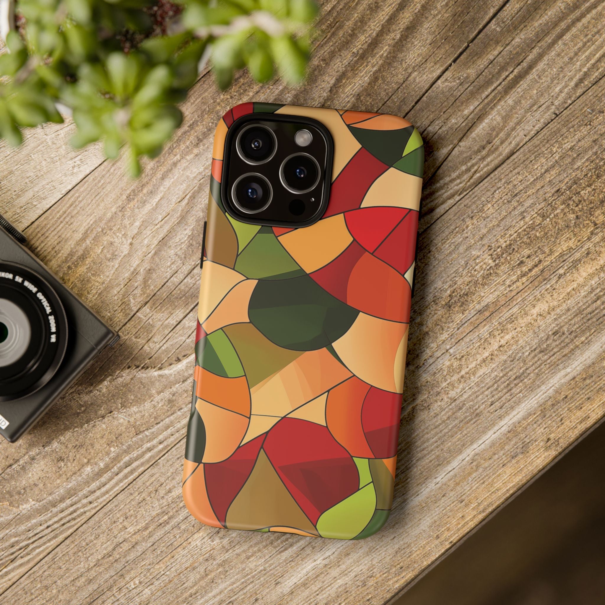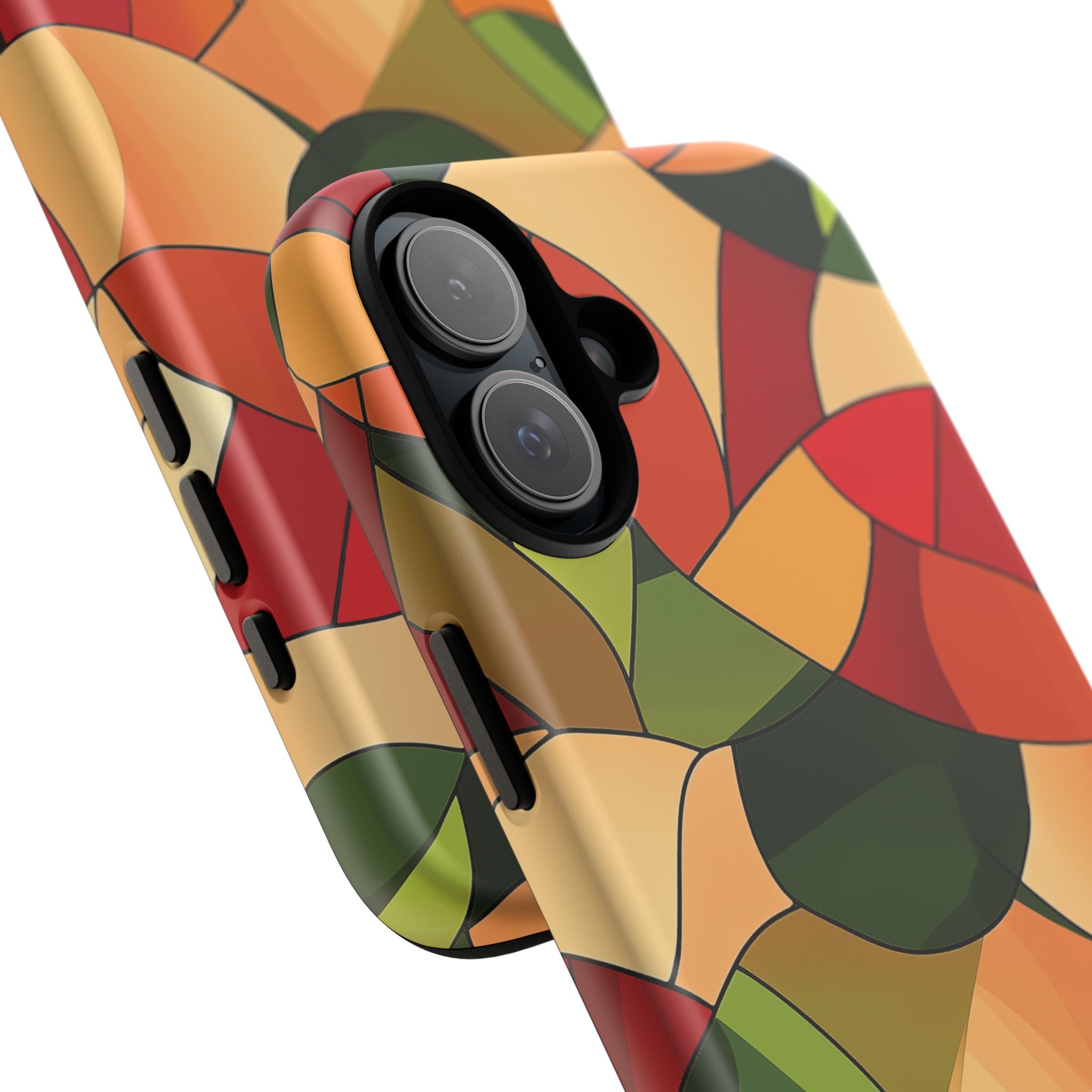 A warm, modern stained-glass mosaic that feels like a cozy autumn walk — rich reds, burnt oranges and olive greens... Read more