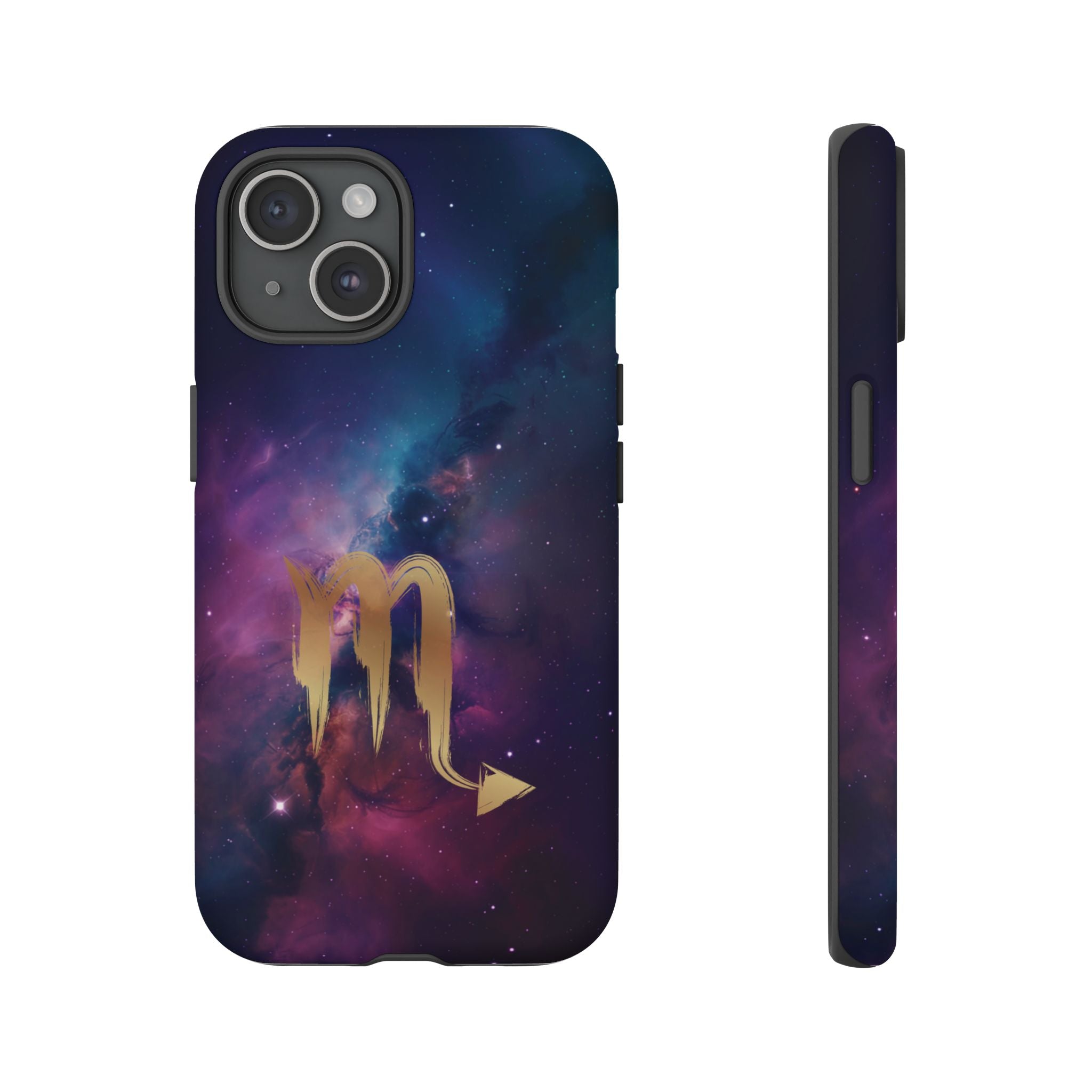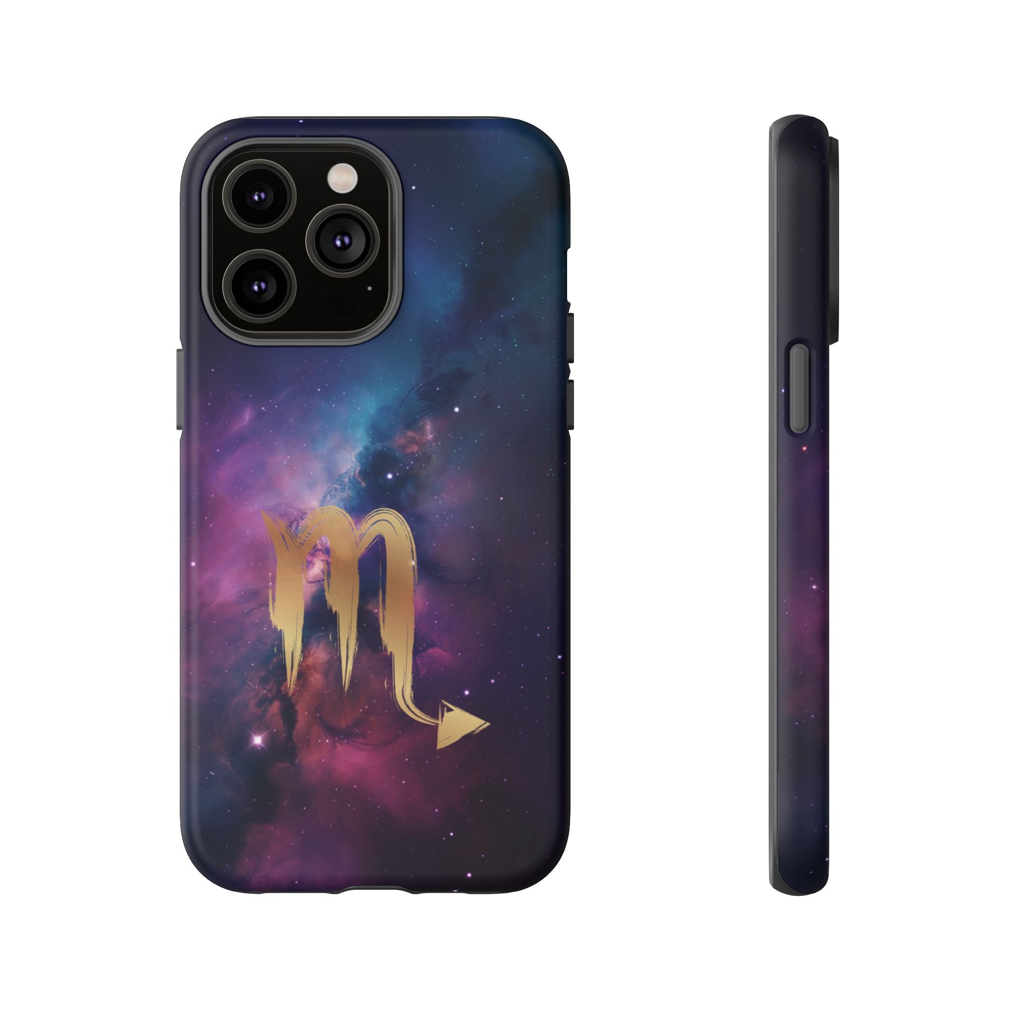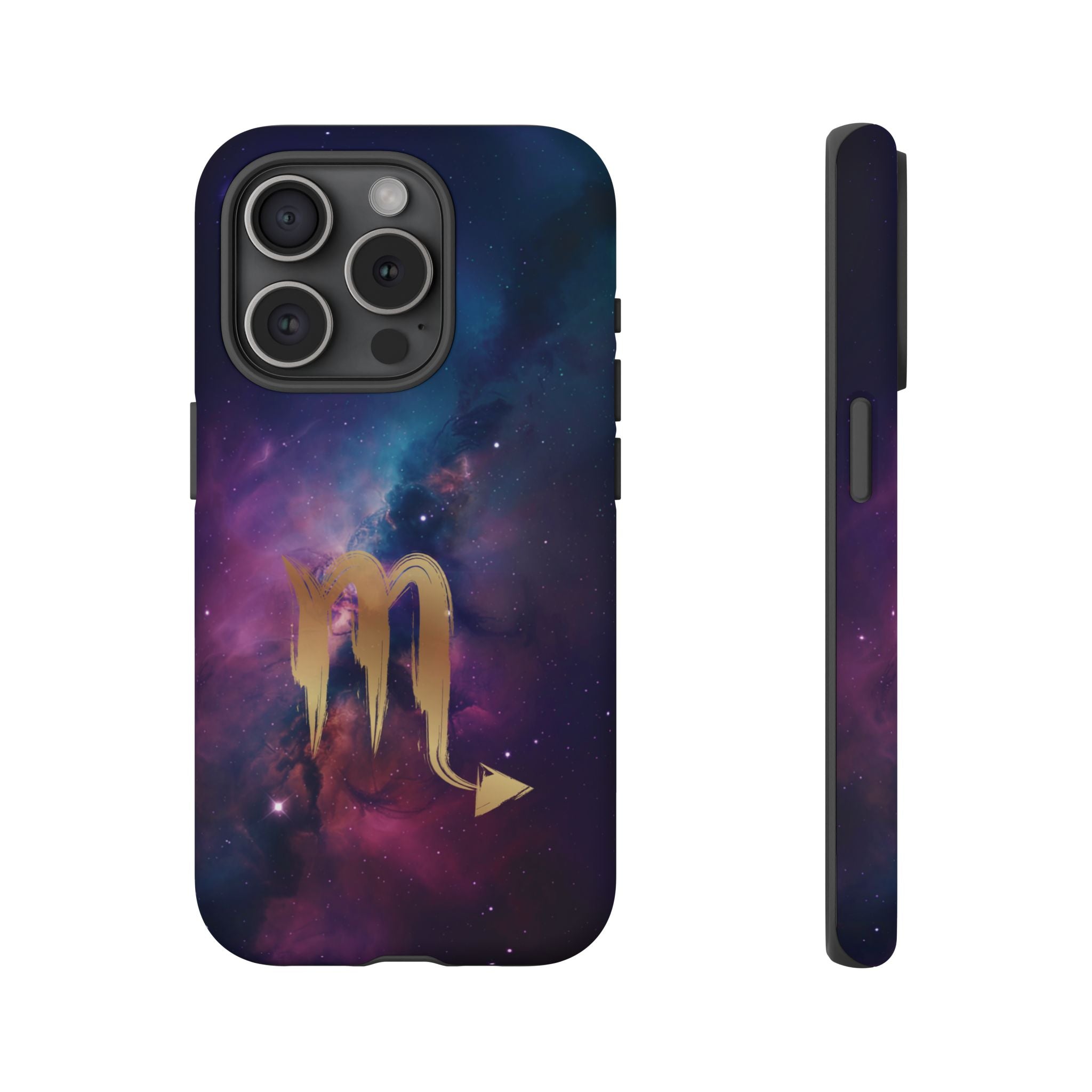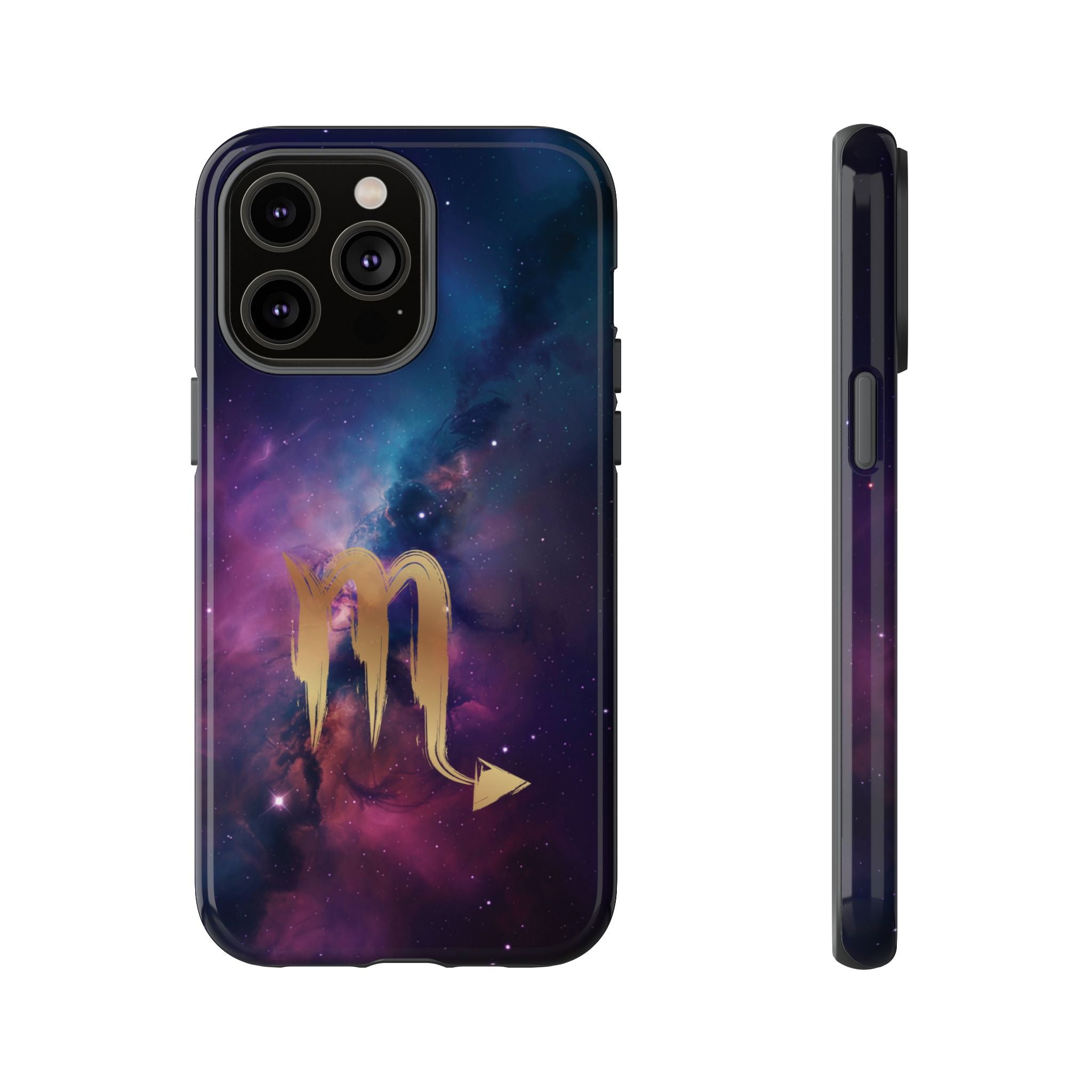 Carry the cosmos in your pocket — a midnight nebula of deep purples and teal with a brushed-gold scorpion glyph... Read more