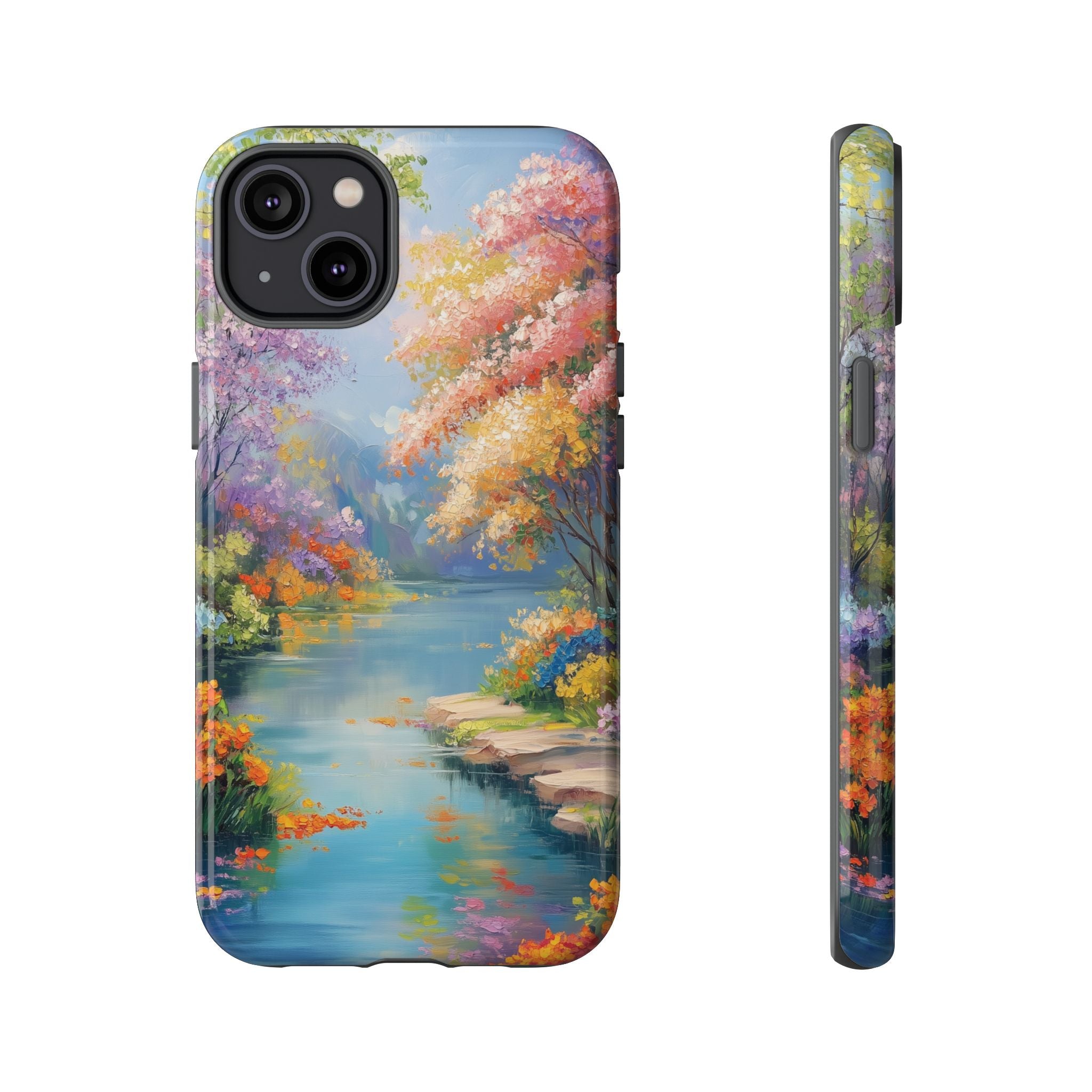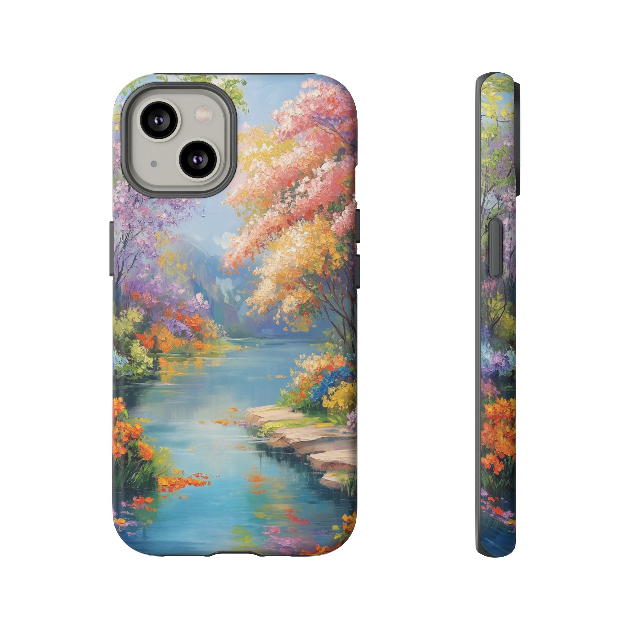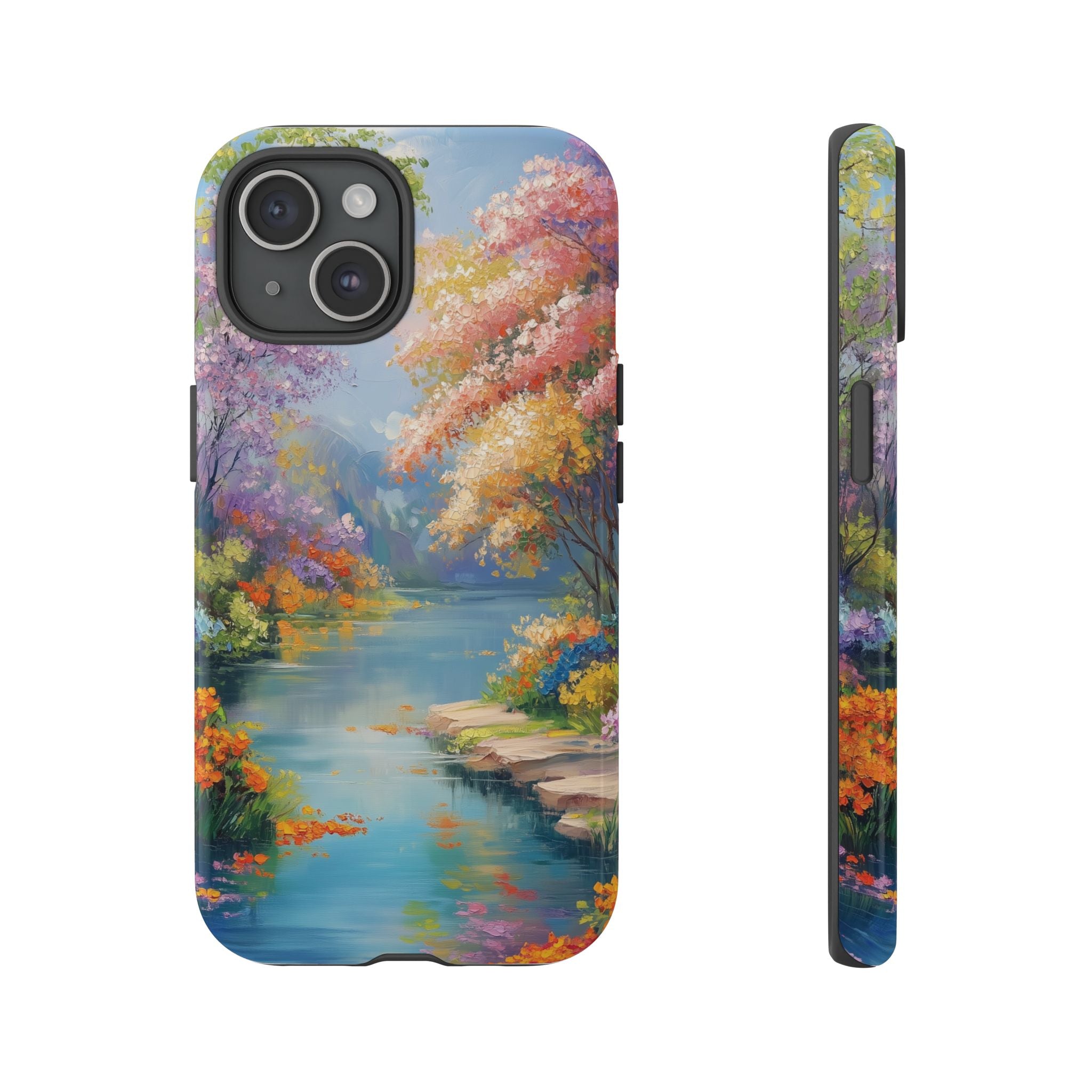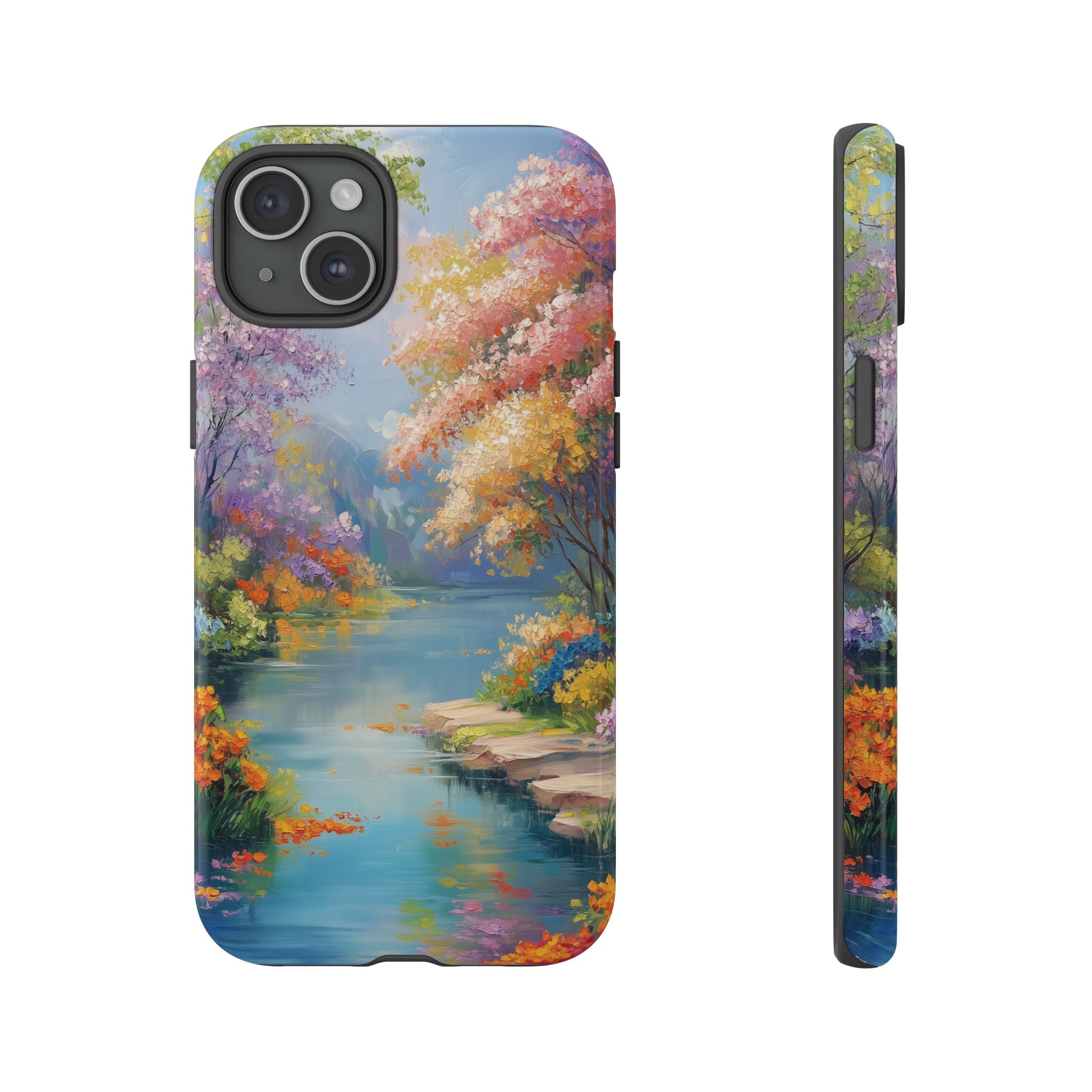 Carry a quiet lakeside with you — a painterly scene of blooming trees and glassy water rendered in soft pastels... Read more