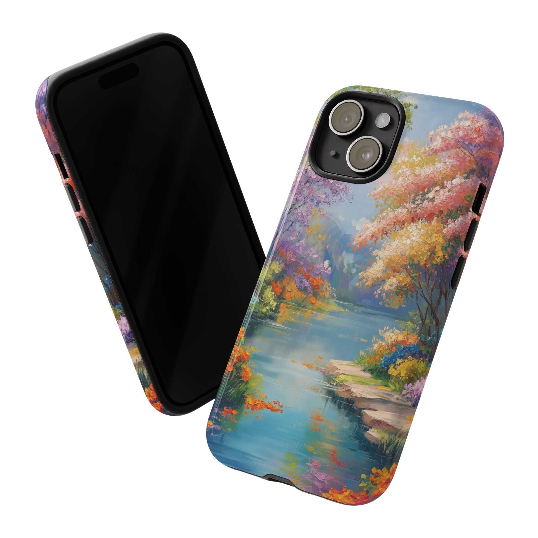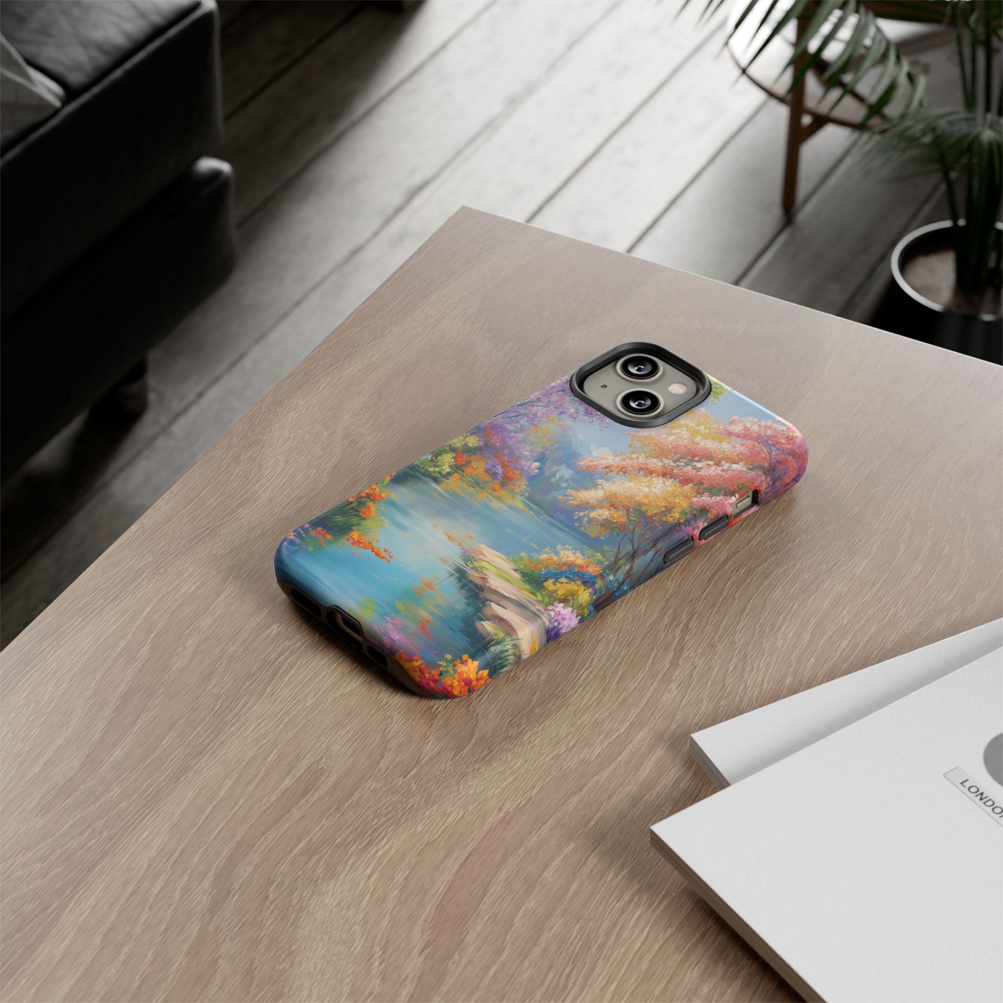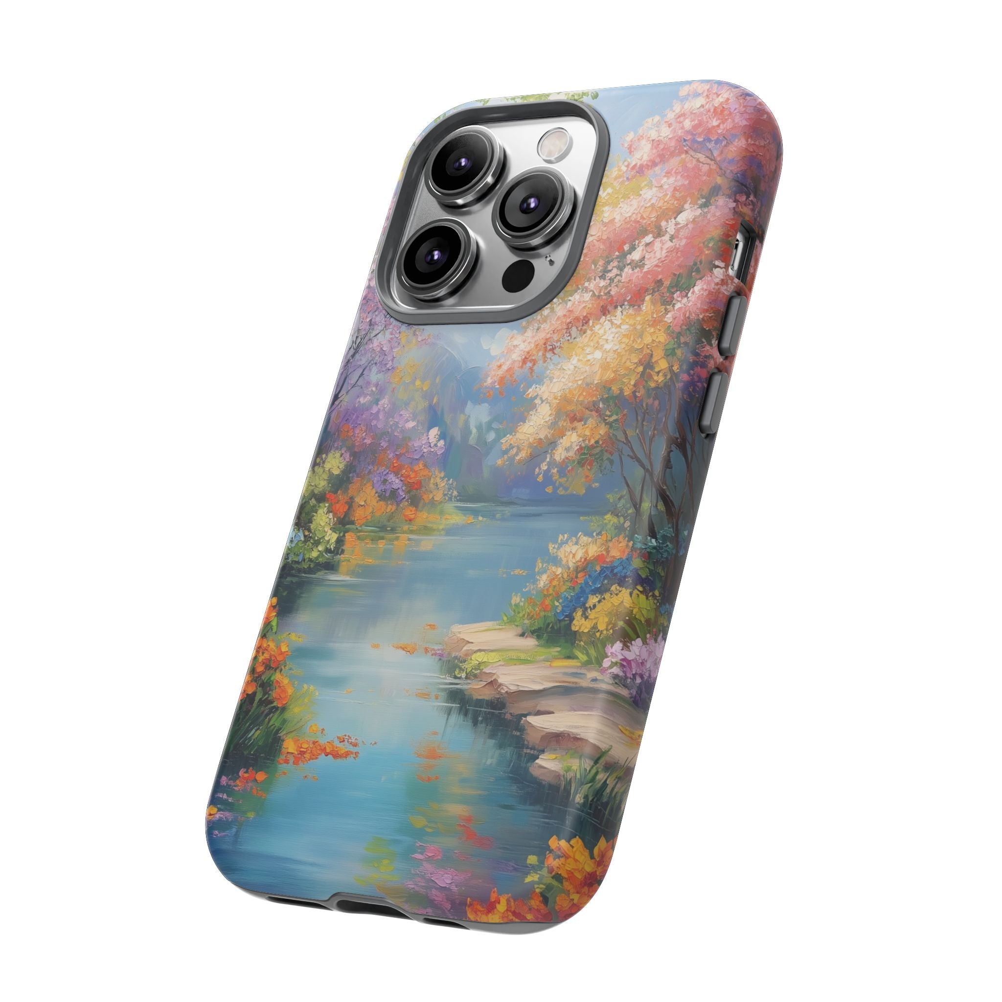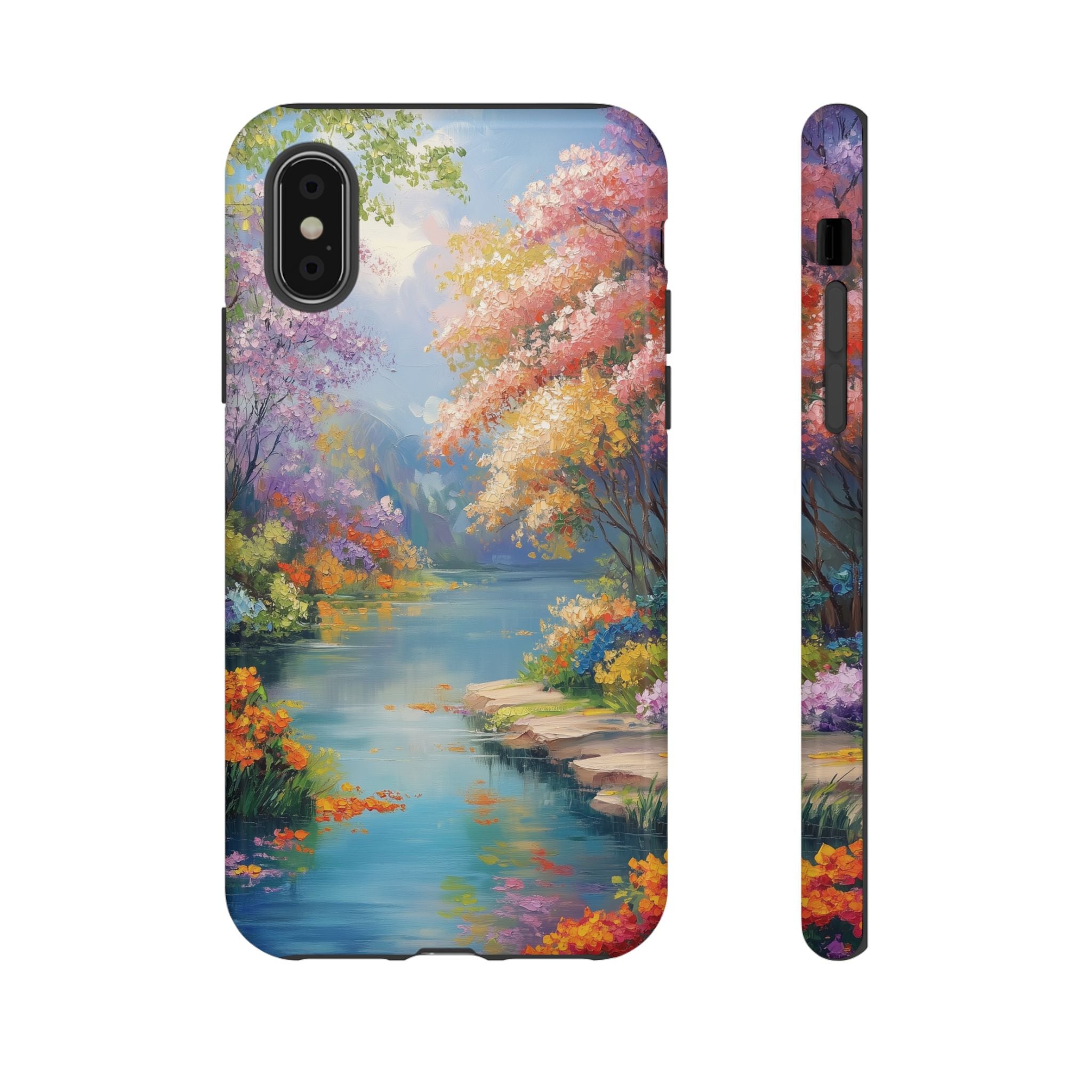 Carry a quiet lakeside with you — a painterly scene of blooming trees and glassy water rendered in soft pastels... Read more