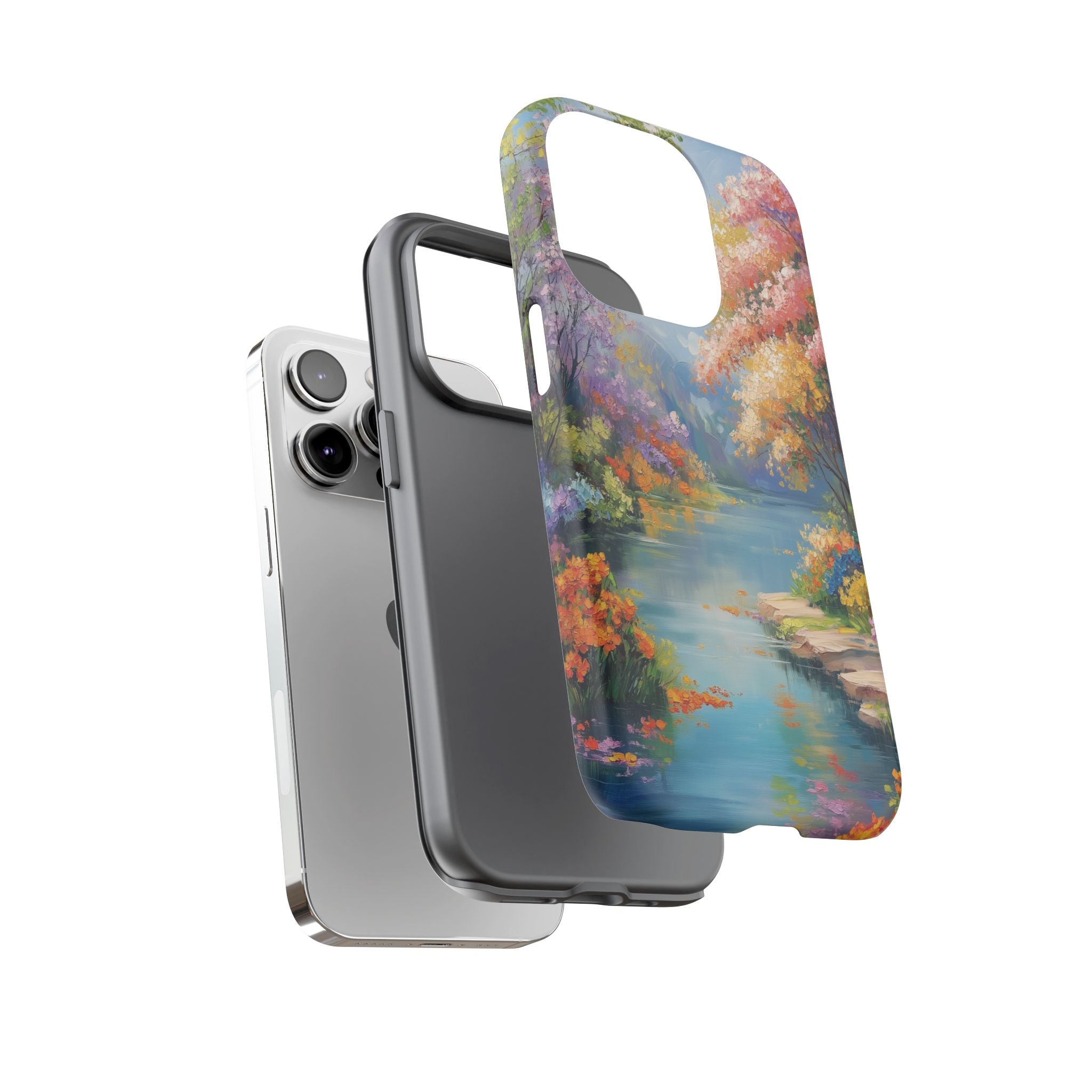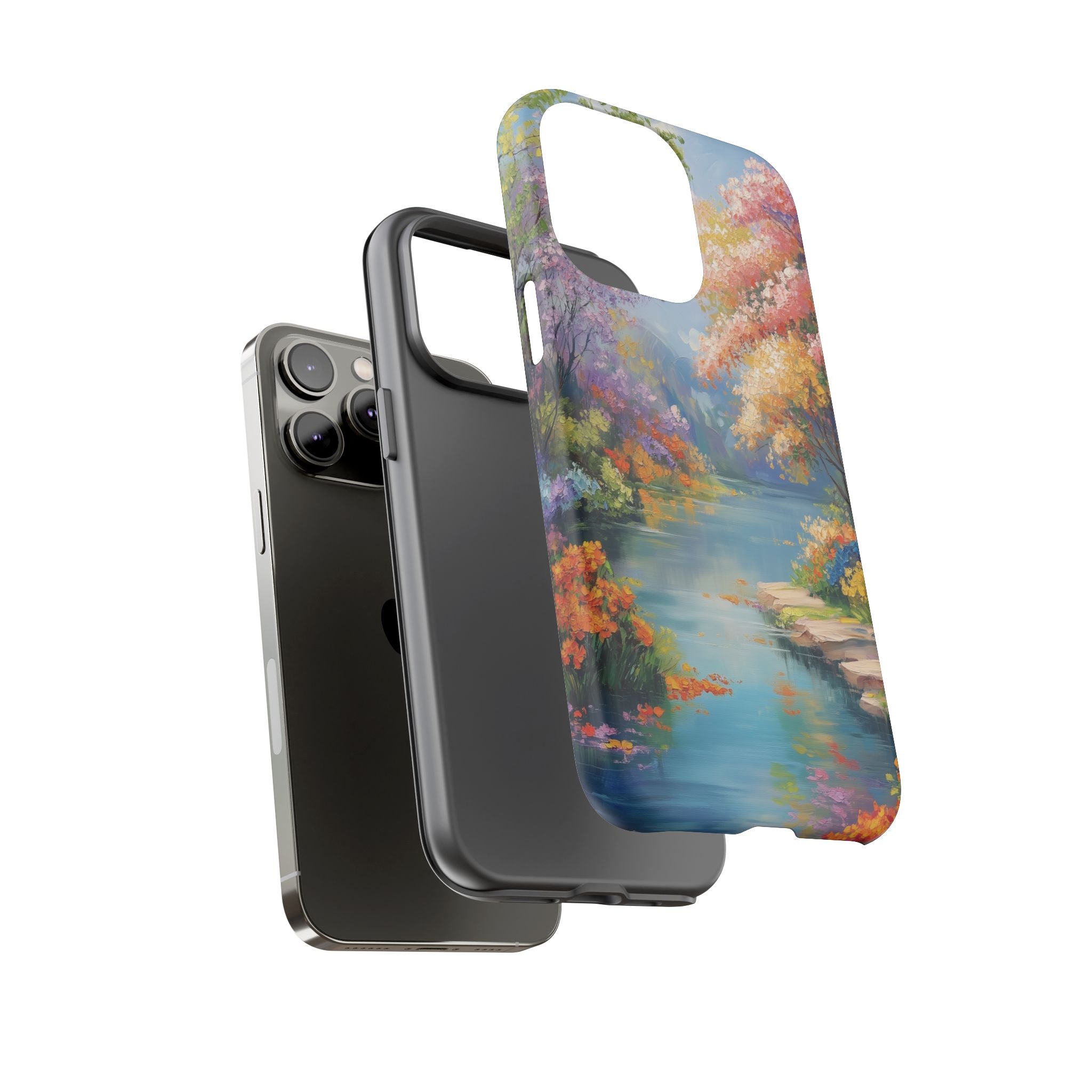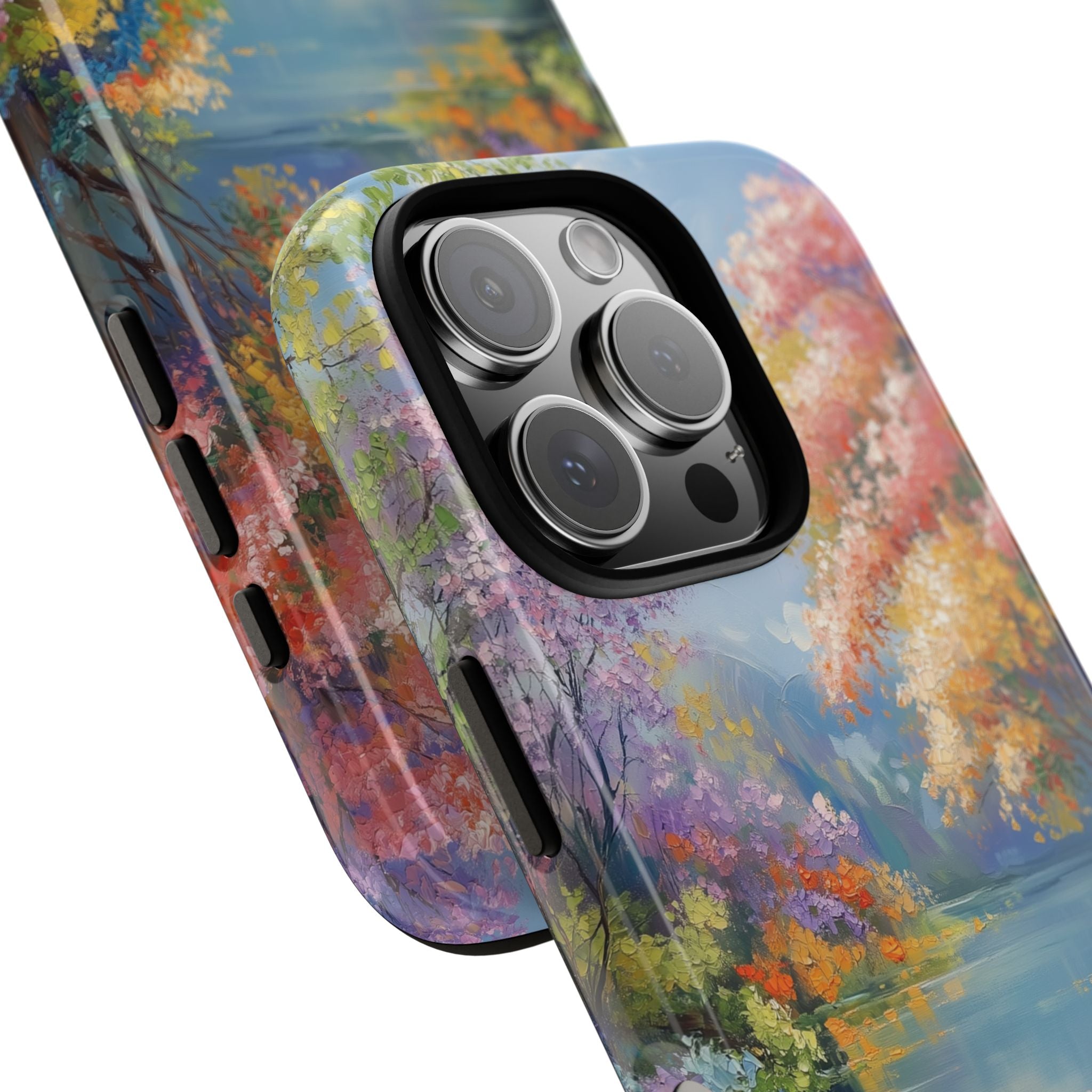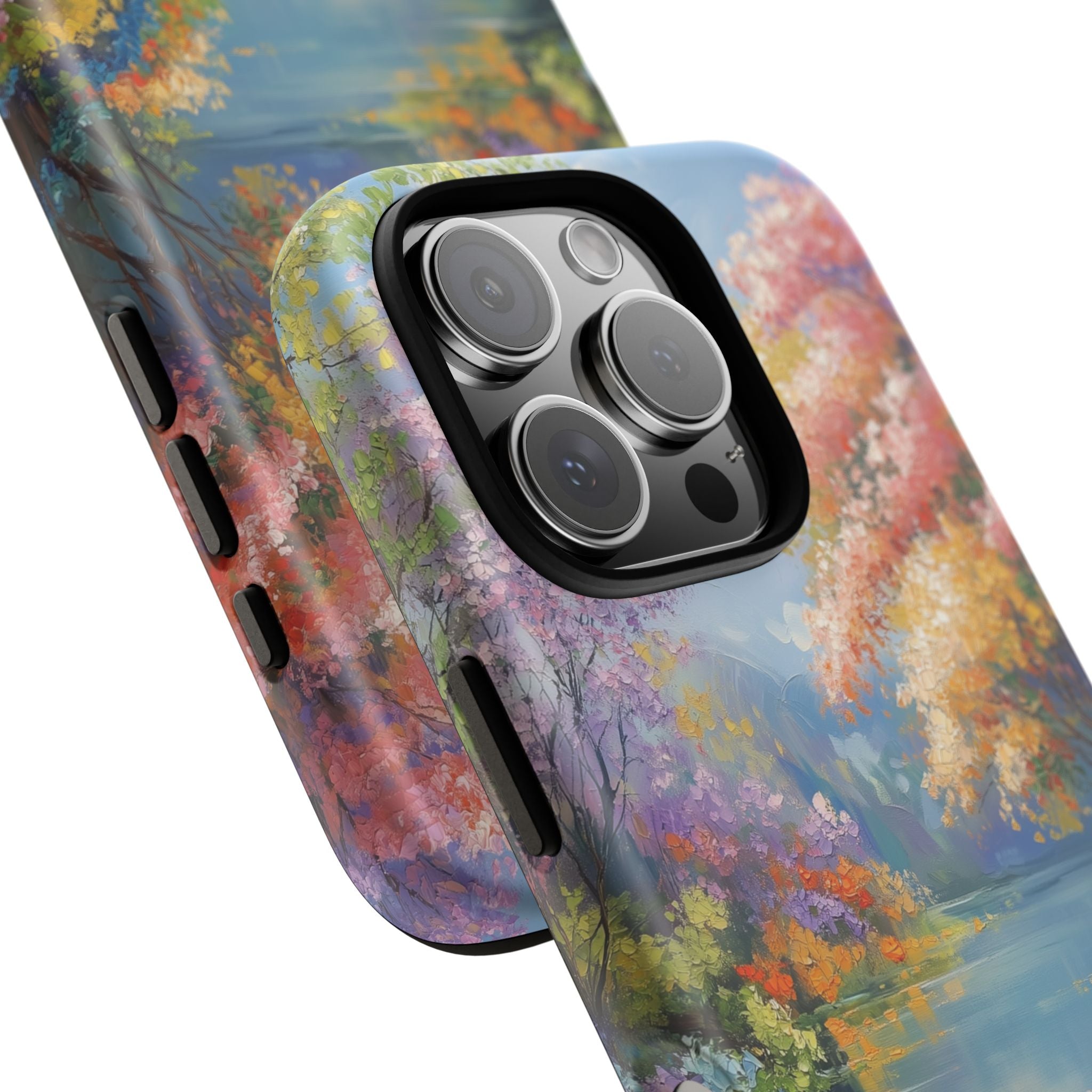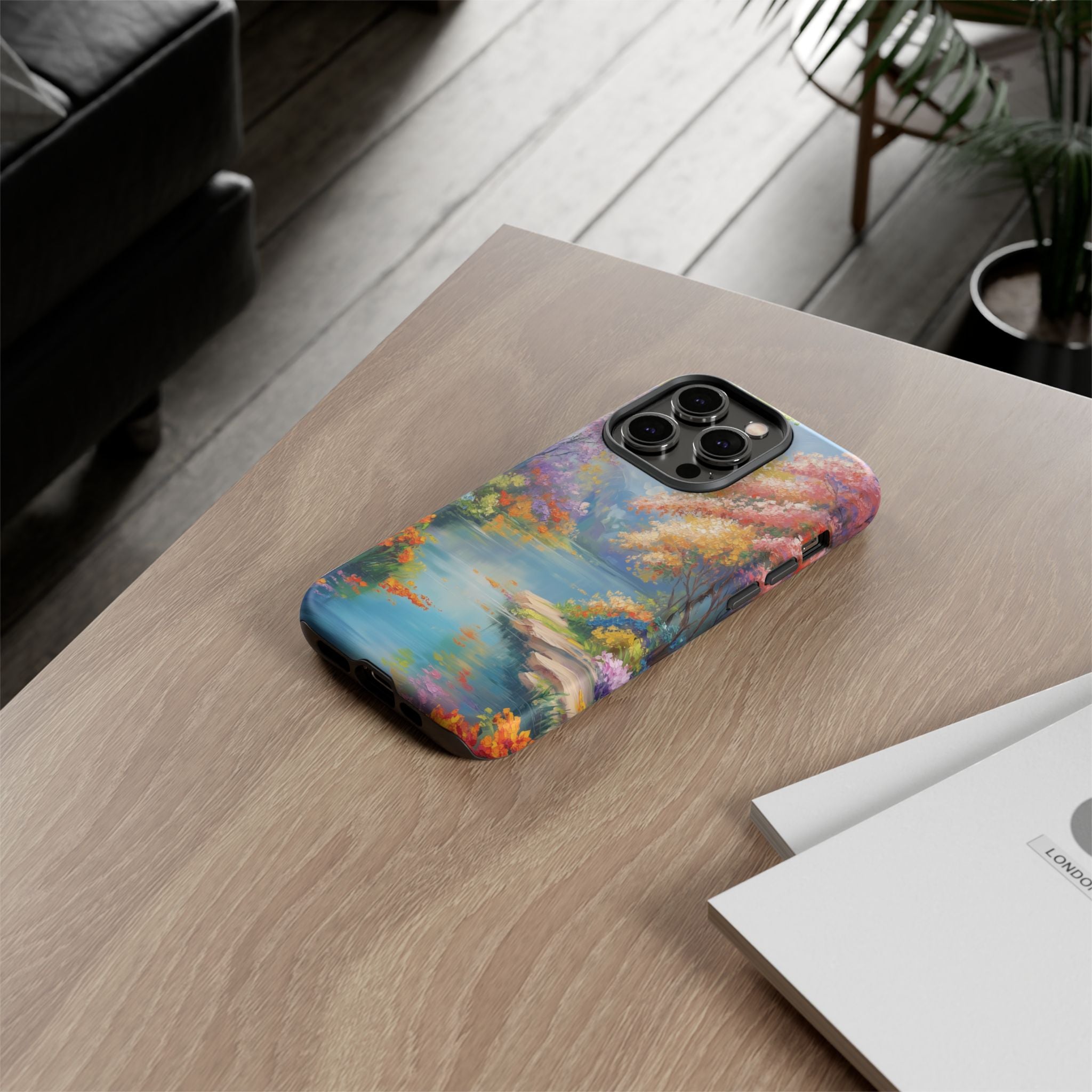Carry a quiet lakeside with you — a painterly scene of blooming trees and glassy water rendered in soft pastels... Read more